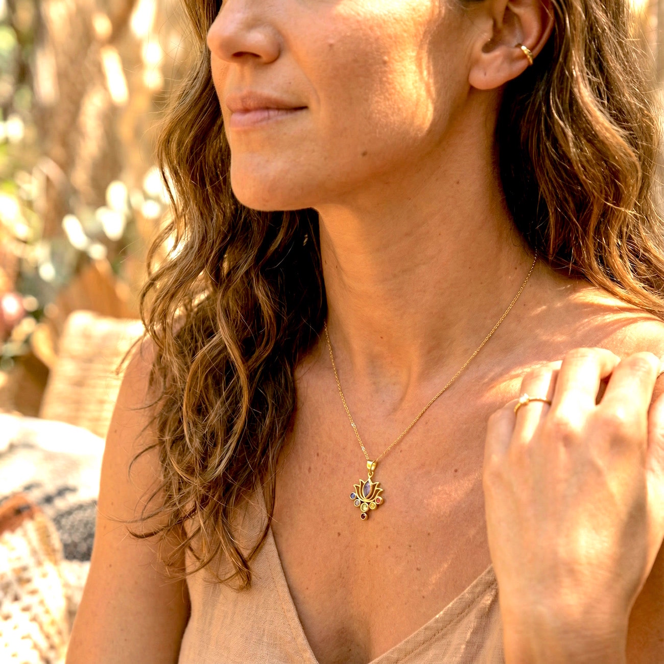 - Design: Lotus-Kettenanhänger mit sieben Chakra-Steinen